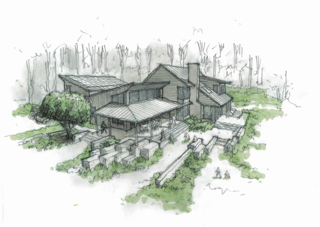 Kaplan Thompson Architects reimagined the existing attached garage of the Acorn House as a generous, double-height kitchen and dining area at the heart of the compound. A glassy mudroom entry connects the kitchen to a new two-story addition providing an overflow sleeping loft above much-needed garage storage. A rooftop solar array on the addition enables the combined compound to achieve net-zero energy. The new hub extends outdoors to a covered porch and playground of stepped granite offcuts. An ornamental tree originally planted by the siblings’ parents couldn’t be saved during construction, but the same species of red maple will be replanted in their memory.