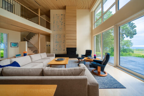 Guests arrive under a mezzanine, next to a stair with banisters fabricated by White Knuckle Kustoms of Windham, into a great room where a pair of Jared Haug paintings from Buoy Gallery in Kittery hang next to the fireplace and a custom sectional sofa faces a wall of Zola windows.