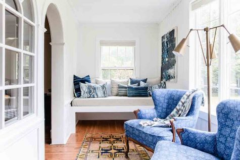 These blue chairs were once Katie’s grandmothers. To give them new life, Katie and Heidi had them reupholstered in vintage indigo fabric. The painting on the wall is by Louis Pierre Lachapelle.