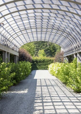 An arbor designed by Deborah Nevins and crafted by NHB from Alaskan (or Canadian) yellow cedar, one of the company’s most-used materials.
