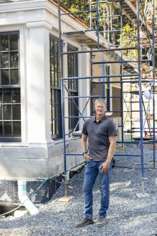 Nate Holyoke stands in front of a large Maine residence that exemplifies his company’s focus on high-level craftsmanship. This home was designed by Ferguson and Shamamian Architects, with landscape architecture by Deborah Nevins and Associates.