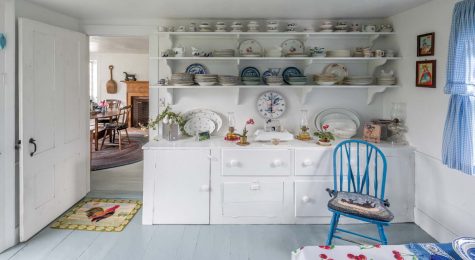 The farmhouse kitchen is largely original and features open shelves stacked with blue-and-white Willow dishware and other china. Through the door, one can see the dining room with its original fireplace and wood surround. An old wooden grain shovel hangs to the left of the mantel.