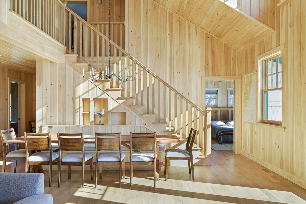 “The home is mostly one story, with a small second floor that features an additional bedroom, bathroom, loft, and small study. The interior was built with knotty pine from a vendor in Maine. The stairs were originally going to be pine, but we switched to white oak so they’d be more durable. The flooring is also white oak, milled in Pennsylvania from a company owned by an Amish family. Everything is very simple—nothing is overdone—and we added only a small amount of trim where needed.